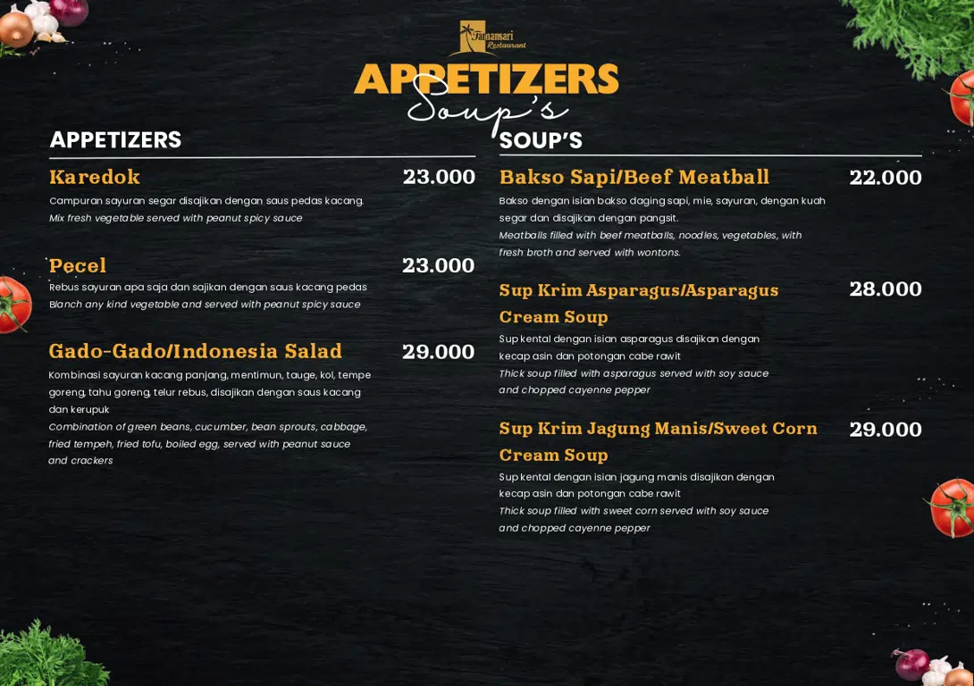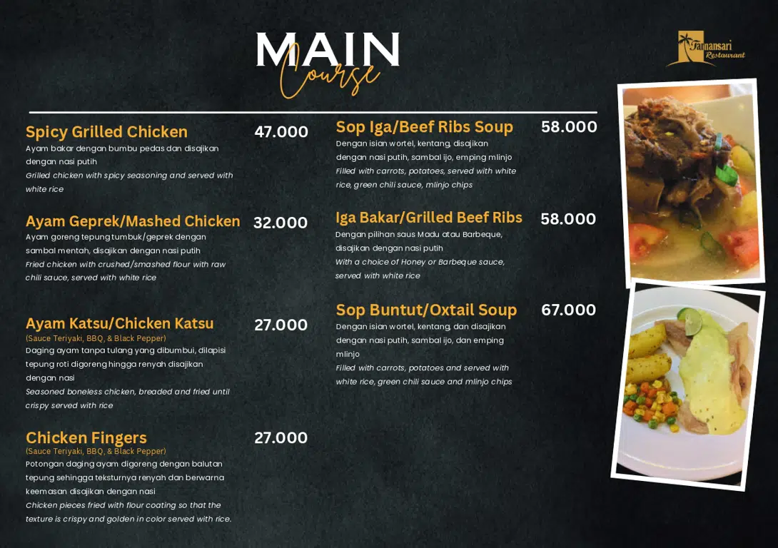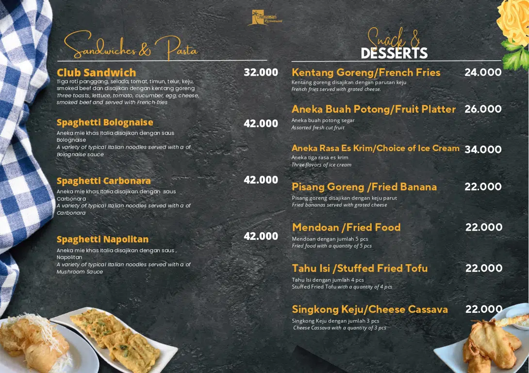 Di pagi hari, Anda bisa menikmati sarapan yang telah kami siapkan untuk memulai aktivitas Anda. Pada siang atau malam hari, tersedia pilihan menu yang dapat Anda nikmati bersama keluarga, teman, maupun kolega.